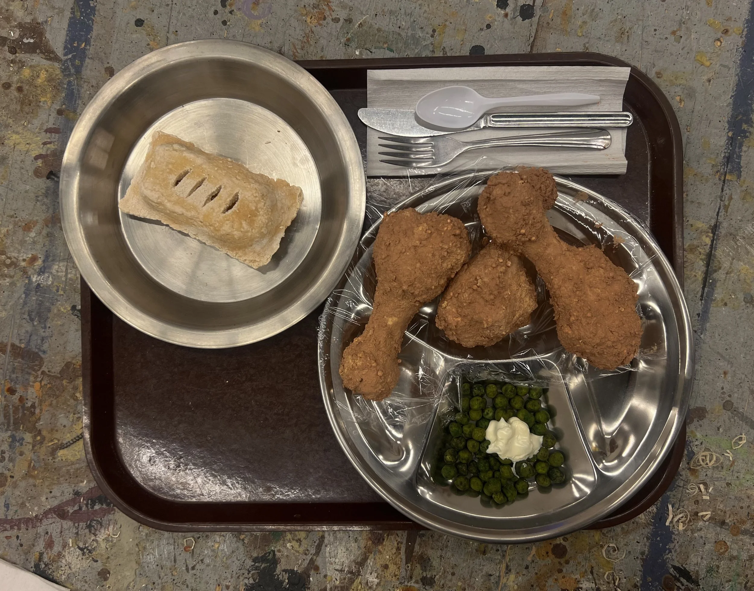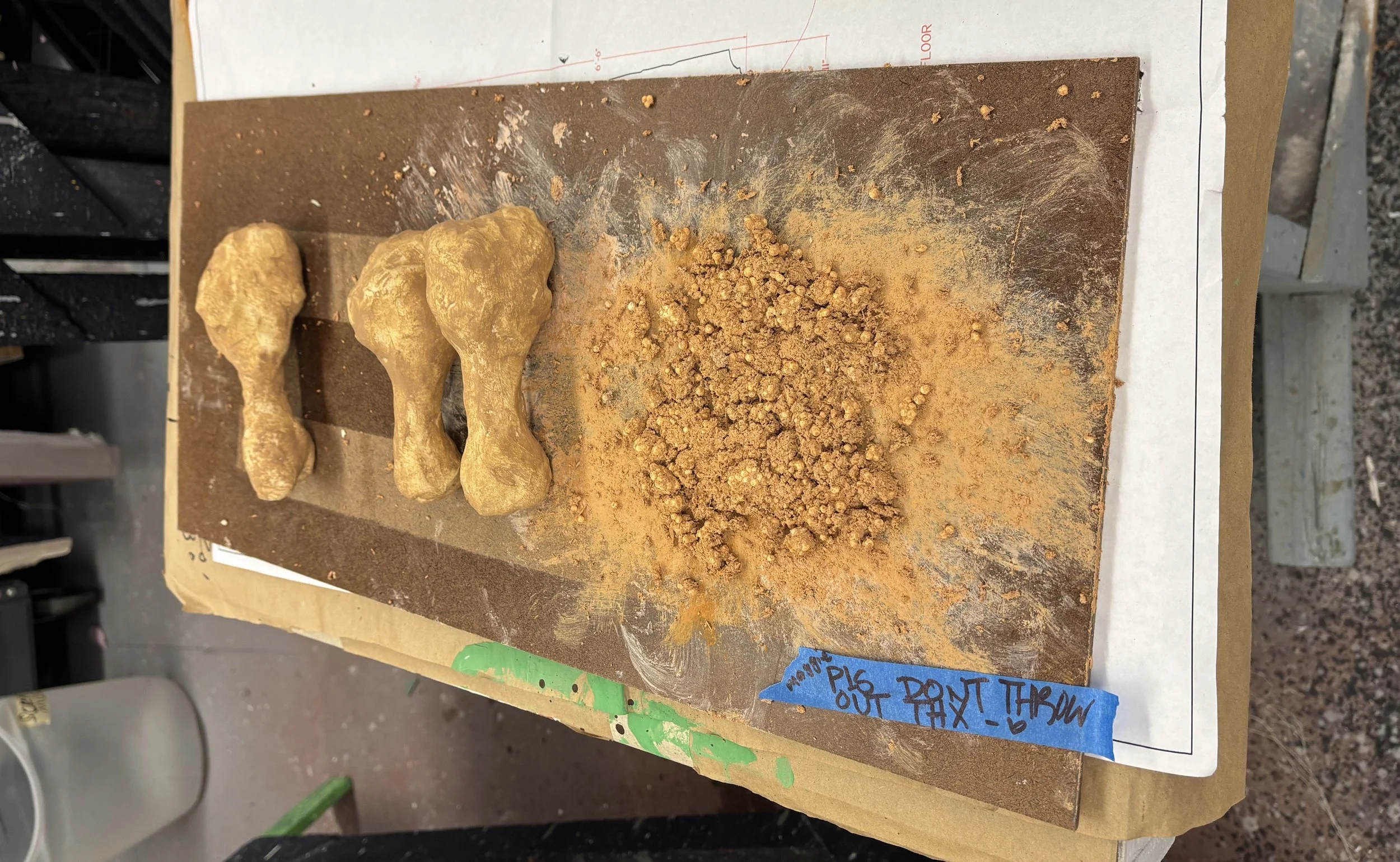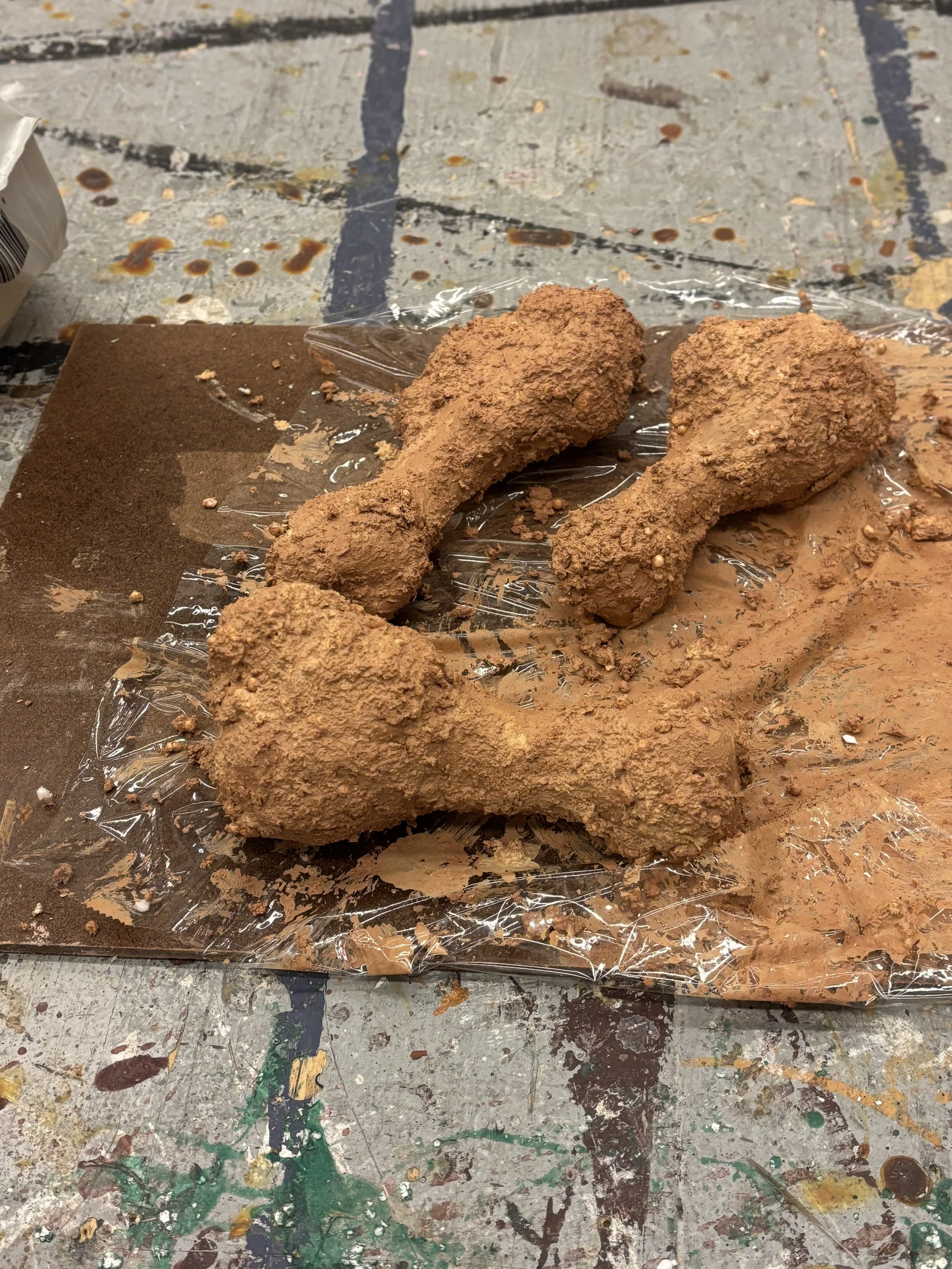 I made this fake fried chicken by sculpting clay into a chicken shape, coating it in Jaxan, sawdust, and bead foam, and painting the surface.